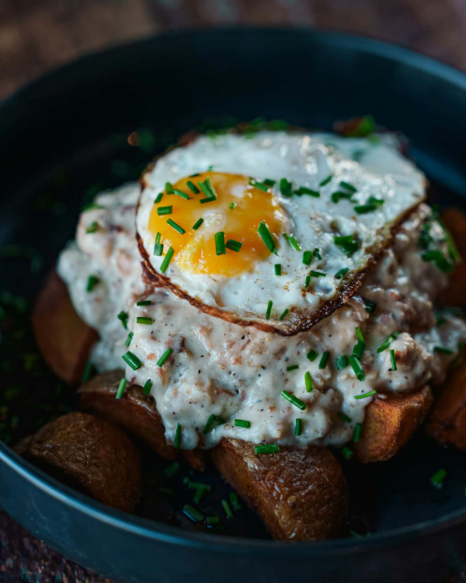 If you’ve had a long week, the Hangover Fries are there for you. Waffle fries under house gravy, bacon, smoked cheddar, jalapeños, and a fried egg. They named them honestly. On the other end of the spectrum, the Chilaquiles — house chips in smoky red chile sauce, topped with cotija and a fried egg — are the kind of thing you’d eat every weekend if you could. Add whatever protein you want. Or don’t. They’re great either way.